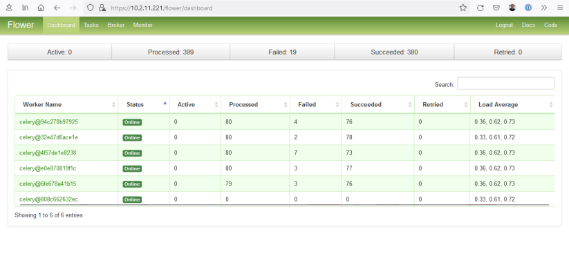 Celery Flower is a web-based tool for monitoring PowerFlow tasks and workers. You can access Flower at https://<IP of PowerFlow>/flower/dashboard.