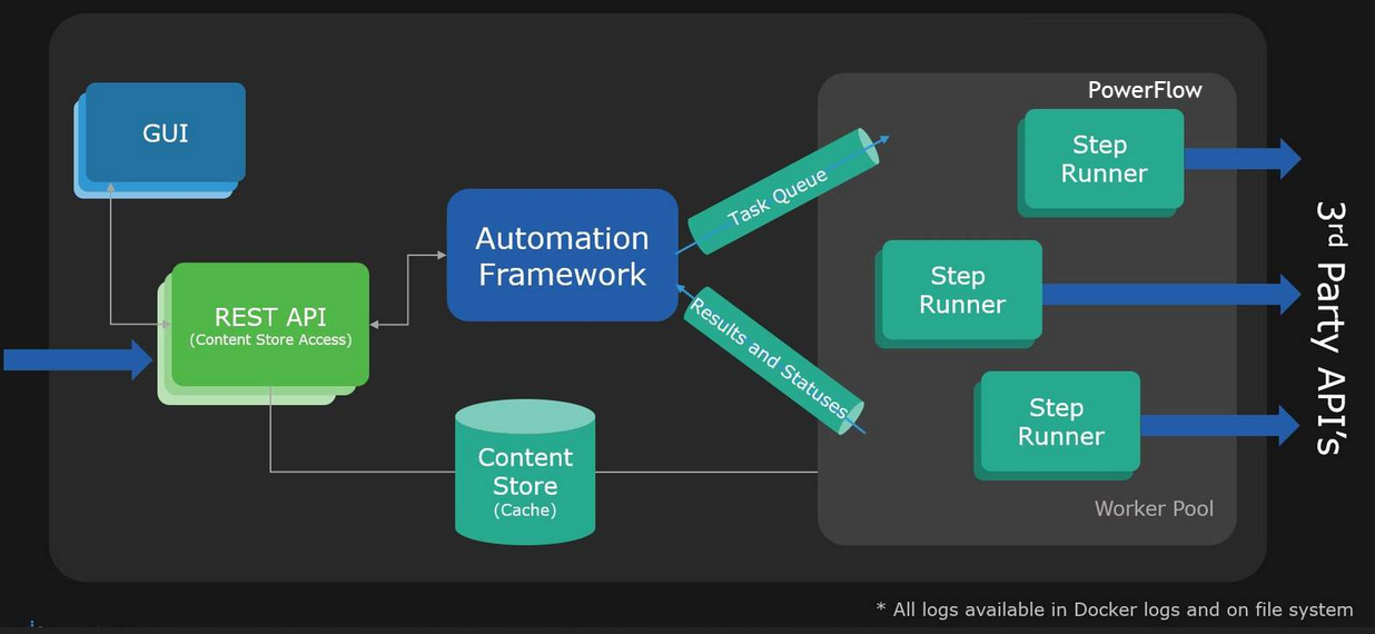 The following diagram describes the container architecture for PowerFlow: