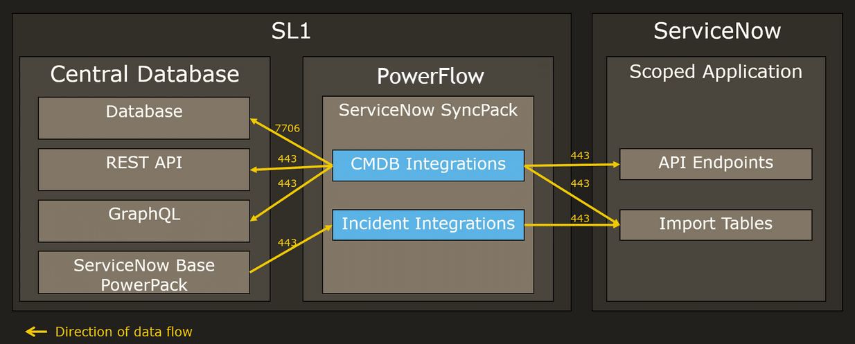 • ServiceNow Base PowerPack. In this example, the Run Book Automations from the ServiceNow Base PowerPack (and other SL1 PowerPacks) communicate with PowerFlow over port 443.