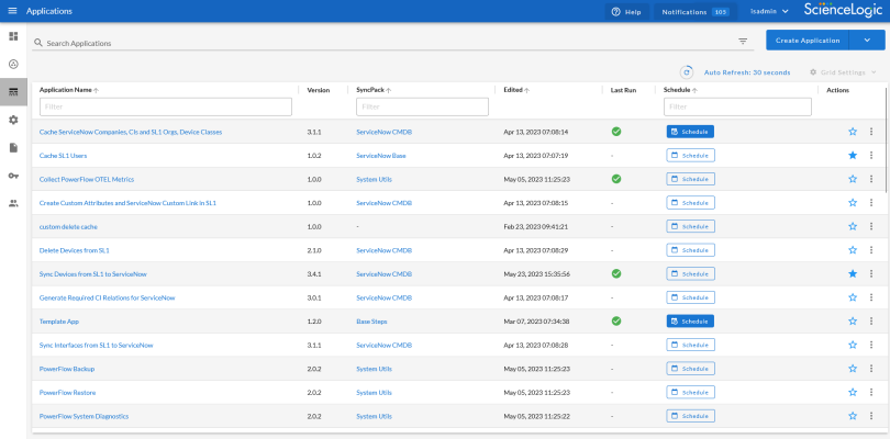 The Applications page () provides a list of available PowerFlow applications on your PowerFlow system. From this page you can schedule, edit, view, and create applications and steps.