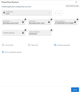 • include_syncpacks. Select this option if you want to restore the SyncPacks you backed up with the "PowerFlow Backup" application.