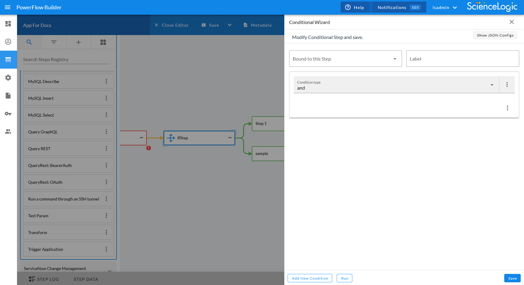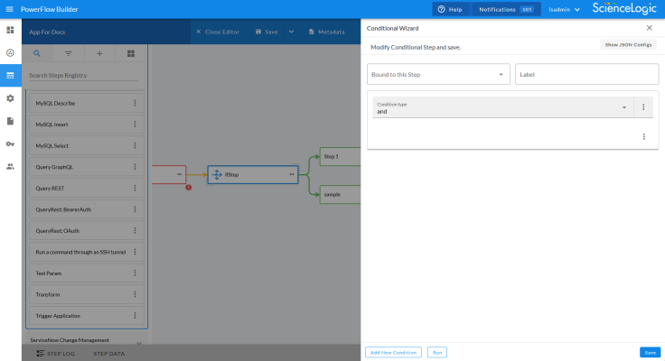 • Open Editor. Opens the Steps Registry pane and launches the PowerFlow builder interface. The Steps Registry pane contains a list of all available steps in the PowerFlow builder.