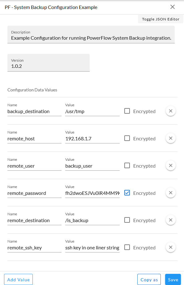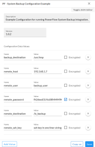 1. To add the relevant configuration information, go to the Configurations page () and click the Edit button or click the Actions button () and select Edit for the "PF - System Backup Configuration Example" configuration object. The Configuration pane appears: