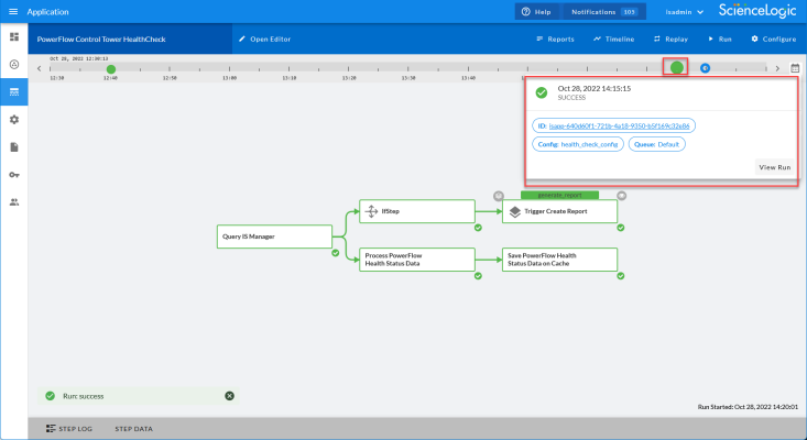 To open the Notification Center pane, which contains a list of all of the pop-up messages about PowerFlow applications that were run successfully or with warnings or failures, click your user name in the navigation bar in the top right and select Notifications. The different notifications are color-coded: green for success, yellow for warning, and red for failure. The number of notifications displays as a badge in the menu. For more information about a notification, click the link for the notification and review the Step Log and Step Data tabs for the application steps.