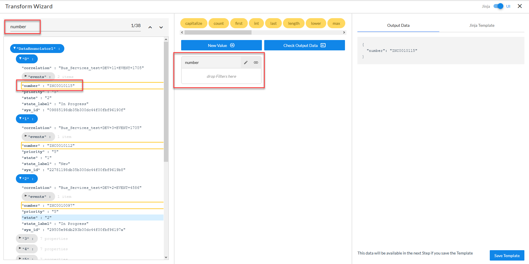 • The Transform operator () lets the application pull data gathered by a previous step and modify or transform that data to fit into the next step. The Transform Wizard pane lets you specify which data you want to use or transform from the previous steps. For more information, see Creating an Application with a Transform Operator.