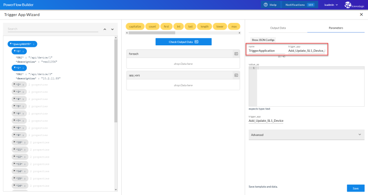 • The Trigger Application operator () lets you launch another PowerFlow application from within a new or existing PowerFlow application. The Trigger App Wizard pane lets you select the child application you want to launch from the current (parent) application and specify the data that you want to pull from the child application. For more information, see Creating an Application with a Trigger Application Operator.