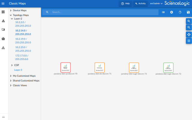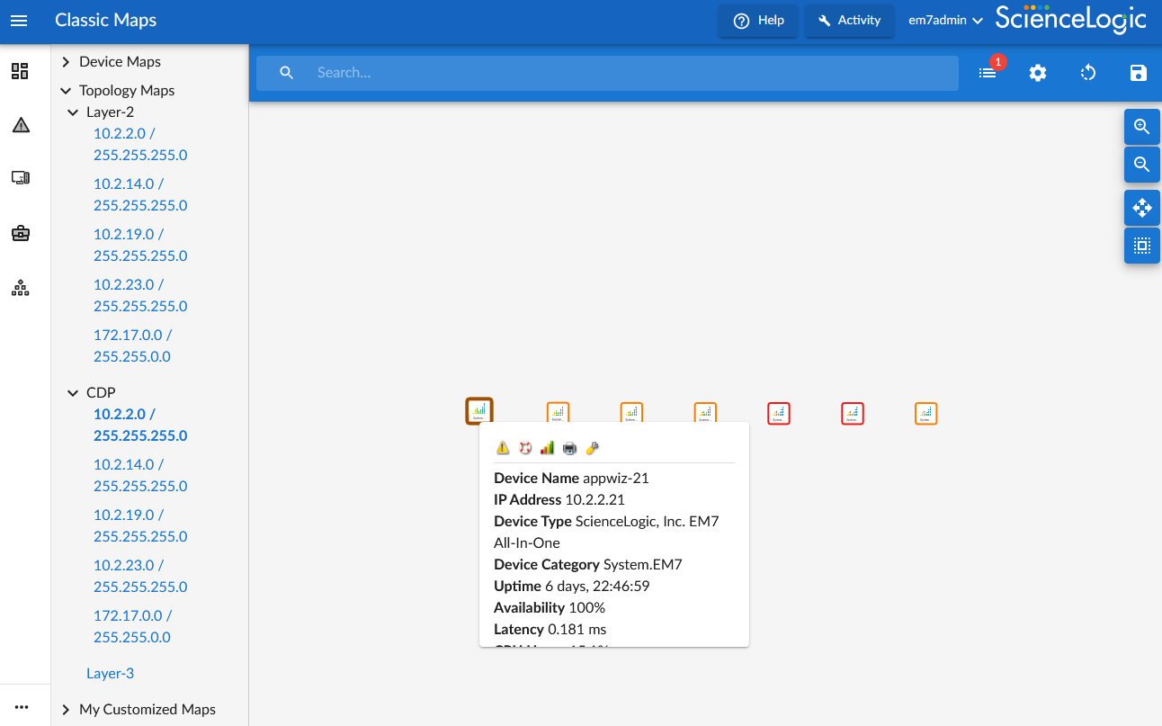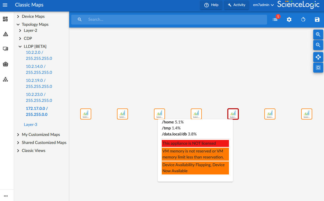 If you enable Enable LLDP Topology, Skylar One automatically discovers all LLDP relationships in your infrastructure. Skylar One then creates graphical representations of those discovered networks and subnets. These graphical representations are called Topology Views. The Maps > Classic Maps > Topology Maps pages allow you to view details and relationships in any network that has been discovered by Skylar One.