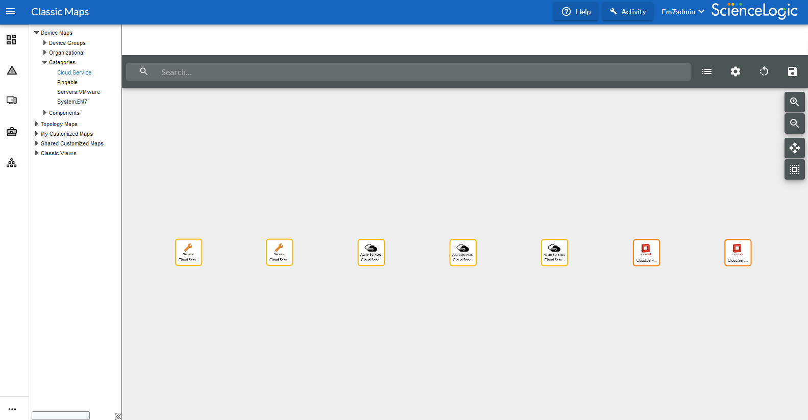 A Classic Map (View) is a graphical representation of a group of devices. The Classic Maps page (Maps > Classic Views, formerly the tab in the classic user interface) allows you to view and edit maps and relationships between devices and virtual infrastructure. In Skylar One, views are organized by device group, organization, device category, component maps, Layer-2 topology, CDP topology, LLDP topology, Layer-3 topology, or Virtual Infrastructure (VMware and virtual machines).