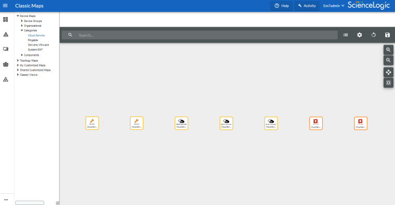 A map is a visual representation of the various devices and related elements, also called nodes, in your environment that have been discovered by Skylar One. A map displays the important details about the nodes, their hierarchy, and the relationships associated with those nodes. In Skylar One, maps are rendered using HTML5.