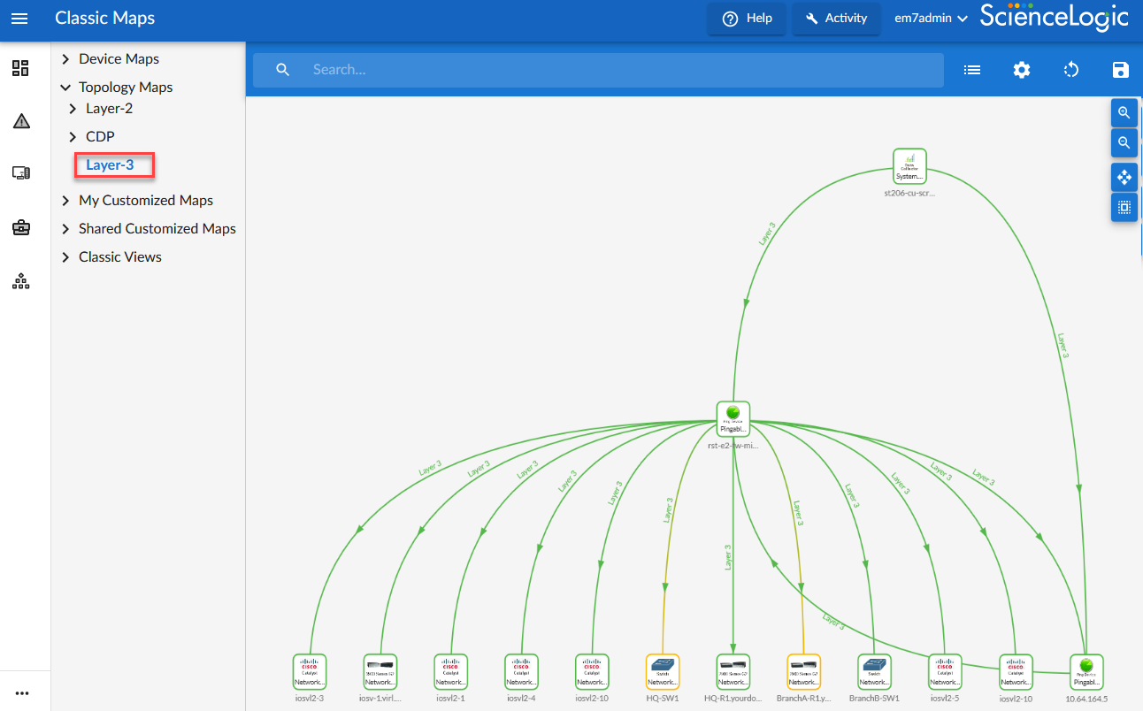 The Layer-3 Maps page (Maps > Classic Maps > Topology Maps > Layer-3) displays a network map, where you can view details and relationships between Data Collectors and layer-3 routers and switches, and between the layer-3 routers and switches that have been discovered by Skylar One.