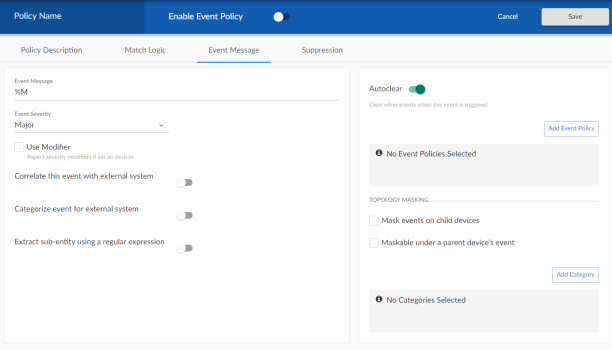 • Enable Event Policy. This toggle allows you to enable and disable the event policy.