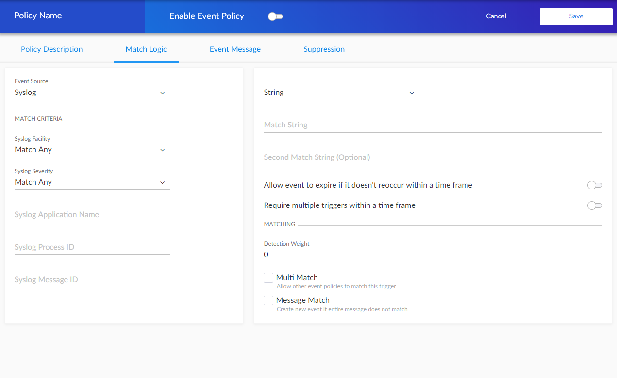 • Match String. A string used to correlate the event with a log message. Can be up to 512 characters in length. To match this event policy, the text of a log message or alert must match the value you enter in this field. Can be any combination of alpha-numeric and multi-byte characters. Skylar One's expression matching is case-sensitive. This field is required for events generated with a source of Syslog, API, and Email.