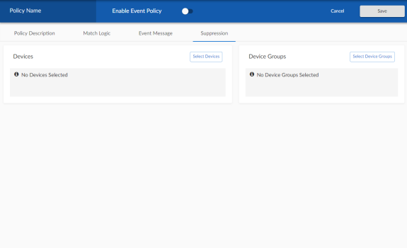 The Suppressions tab in the Event Policy Editor page allows you to suppress the event on selected devices or all devices in selected device groups. When you suppress an event, you are specifying that, in the future, if this event occurs again on a specific device, the event will not appear on the Events page.