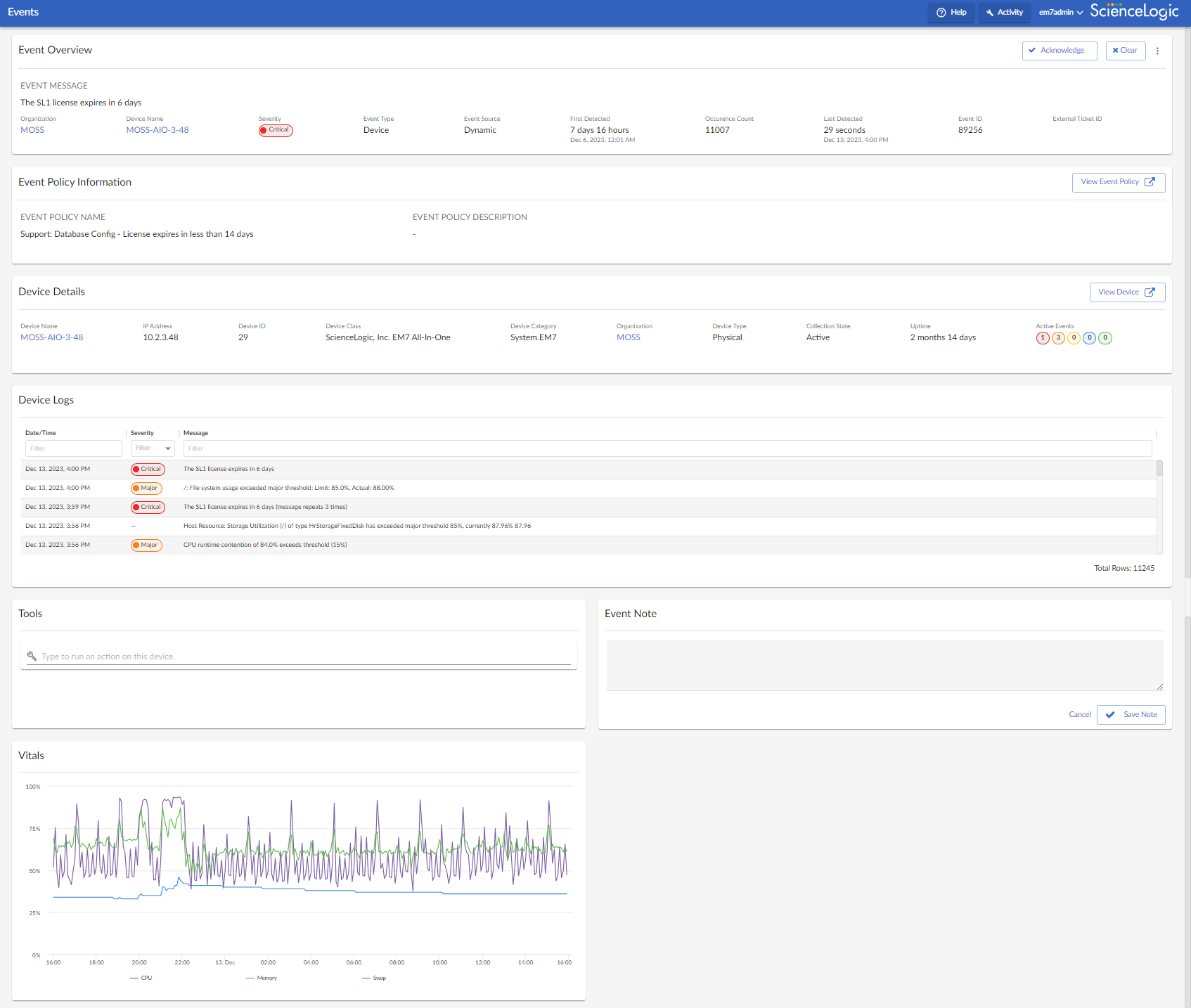 1. On the Events page, click the message for a predictive alert with the Skylar icon (). The Event Investigator page for that alert appears.