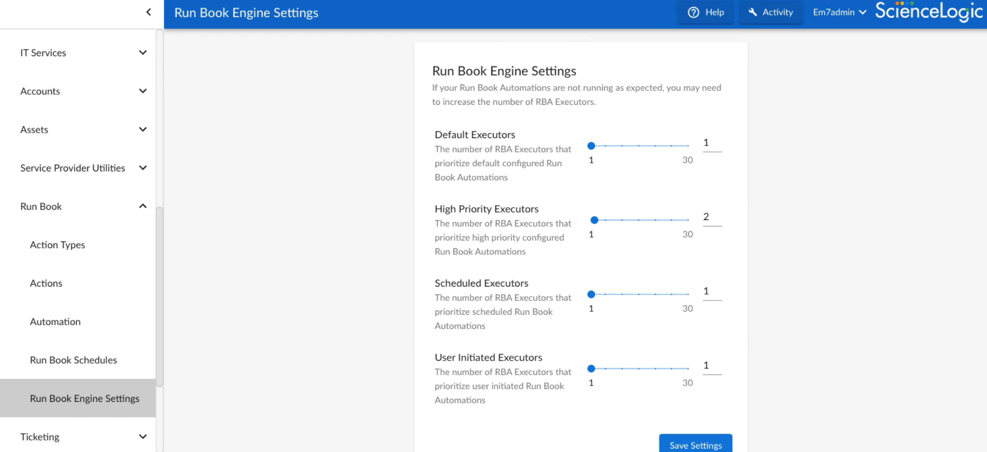 On the Run Book Engine Settings page, you can edit the following settings related to RBA Executors: