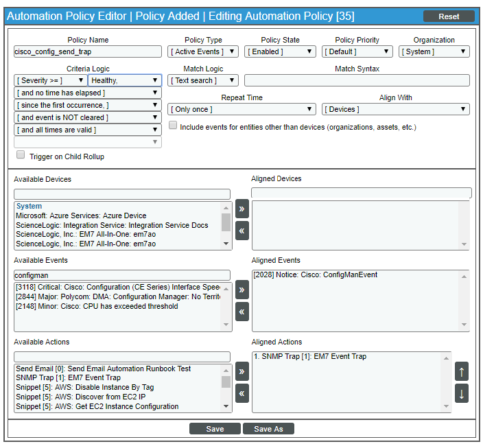 - We specified that when all the criteria in the automation policy are met, the action policy "send_event_trap" will be executed.