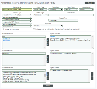 Suppose we want to automatically create a ticket in response to a specific set of event conditions. We will use a modified version of the automation policy used in the examples above. Suppose that each time an event occurs, we immediately want to create a high priority ticket that specifies the emergency actions that must be performed. In this example, we'll automatically create a ticket about each instance of the event "Critical: APC: UPS Battery Capacity".