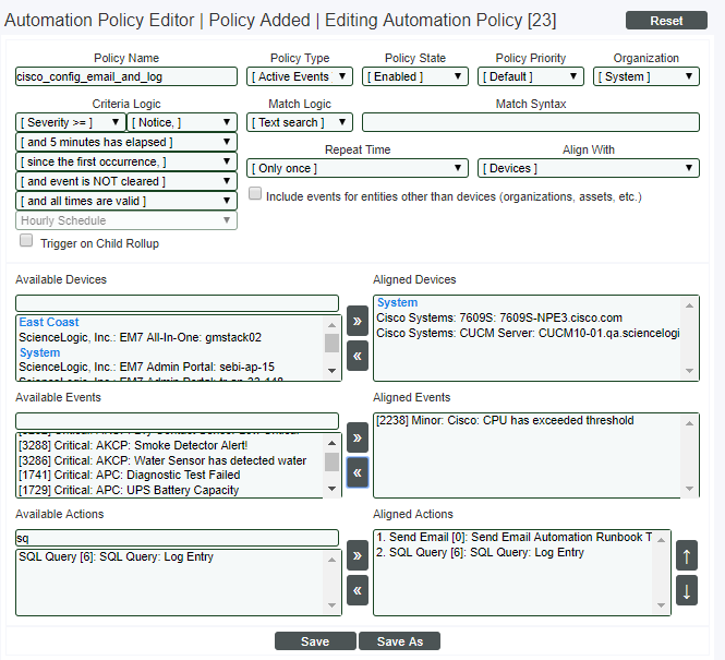 For our example, we'll use a modification of the previous automation policy that sends an email ("cisco_config_email"). Our modification will include an email action and also include an action that use SQL to log the instance of the email action.