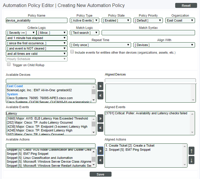 - Will be triggered when the event "Critical Poller: Availability and Latency checks failed" occurs on at least one of the selected devices (which in this case is all devices).