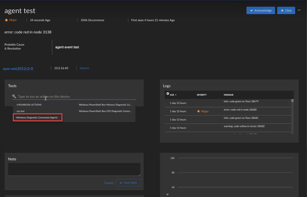 13. When an event occurs on the agent device, you can open the Event Investigator page for that event and run this user-initiated run book action by selecting the action from the Tools pane: