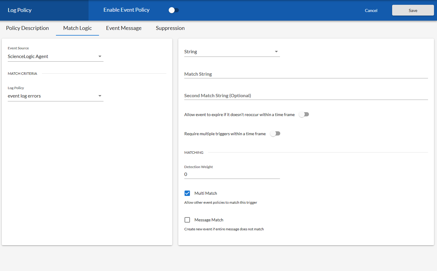 1. After selecting and defining your Event Source, enter values in the fields on the right side of the Match Logic tab specify the text that must appear in the log message for the event policy to trigger: