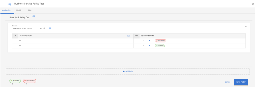 1. Click the Status Policy tab to view the service policy definition for Health, Availability, and Risk for that service.