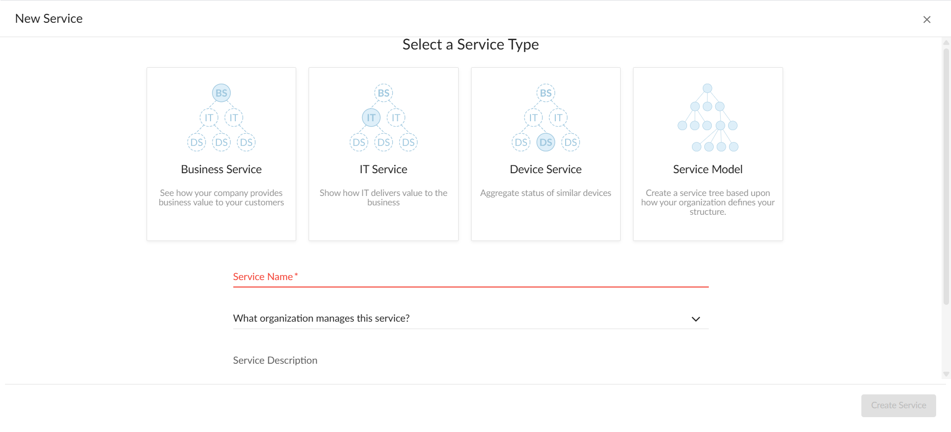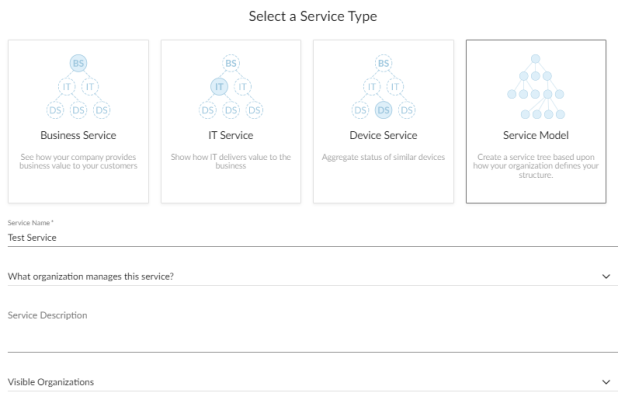 1. Select a service type. You should start by creating your device services, then your IT services, and then finally your business service. Your options include: