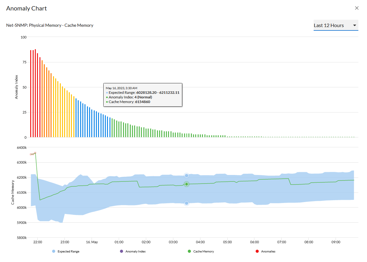 • A red dot indicating anomalies where the actual value appears outside of the expected value range.