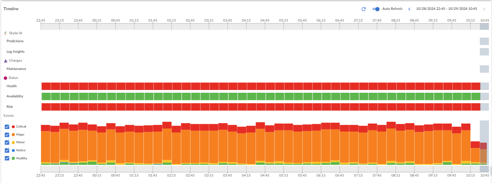 • Timeline. A panel that displays swim lanes and bar graphs to show Historical, Change, Health, Availability, Risk, and Skylar Automated RCA events. Swim lanes are visual flowcharts that show a process from start to finish for an event.