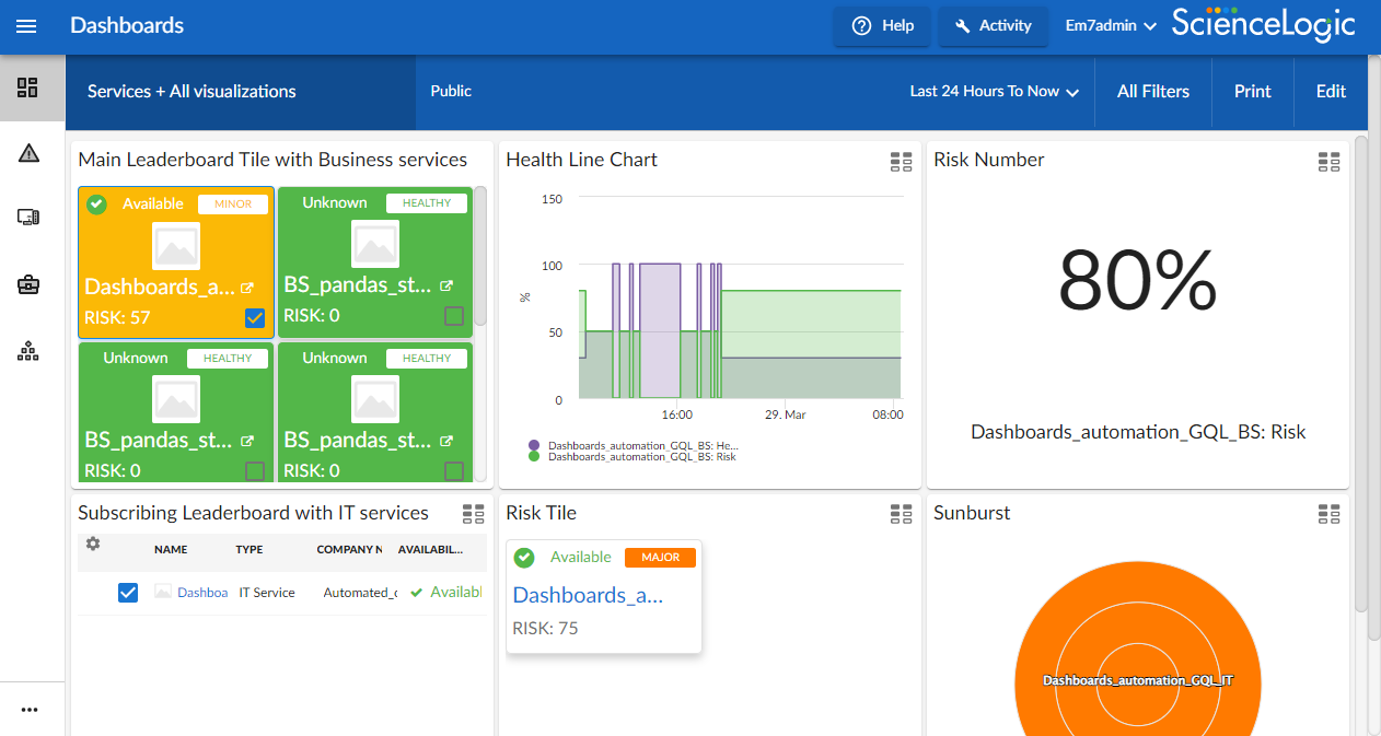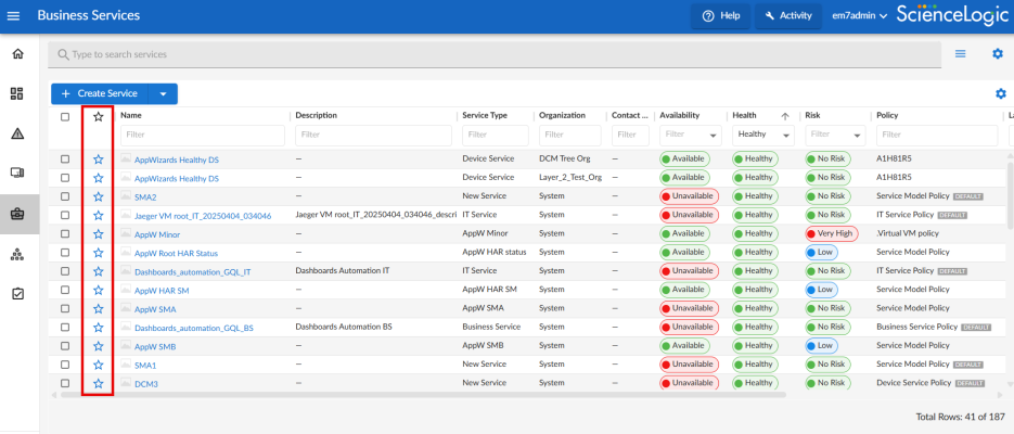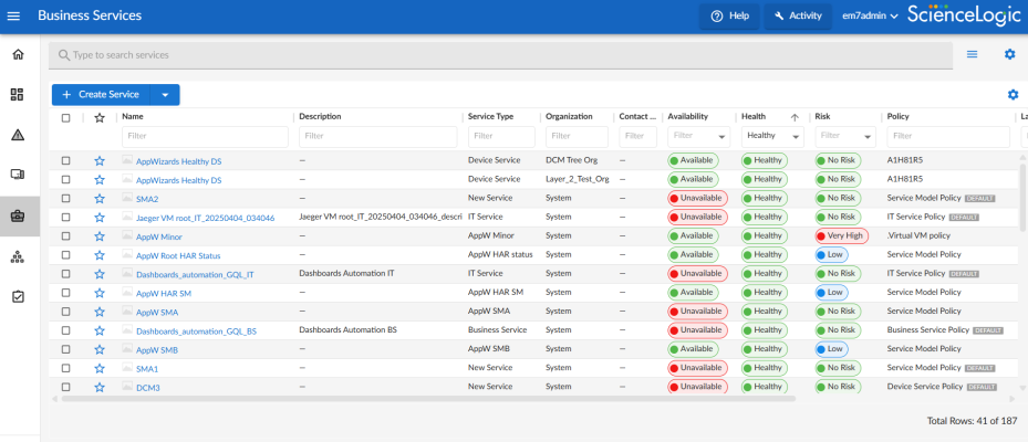 This section describes how to use Skylar One (formerly SL1) to create and manage business services for your company. Business services let you gauge the availability, health, and risk of your services and the devices that provide those services.