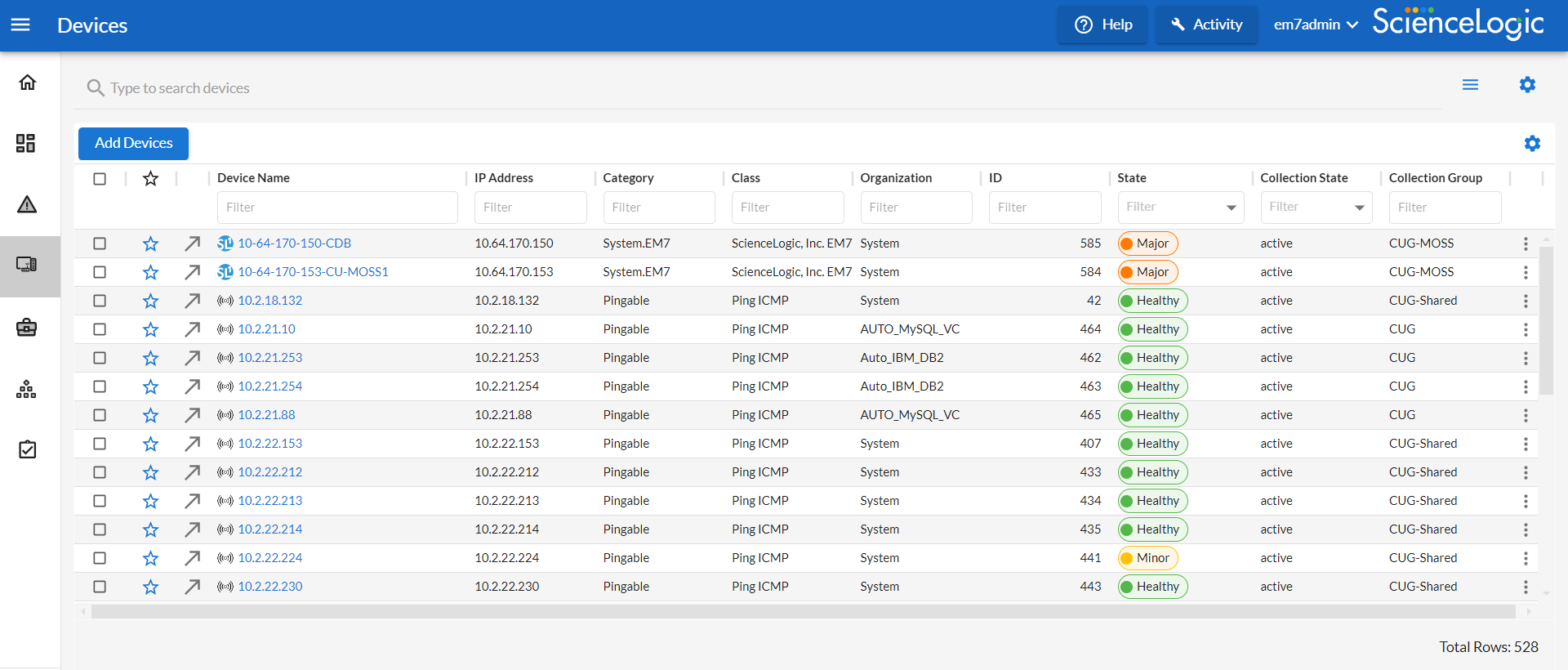 The Devices page allows you to view all of your managed devices in Skylar One (formerly SL1) and also run a discovery to find more devices to monitor. You can select a device from the list on the Devices page to view detailed data on the Device Investigator page for that device.