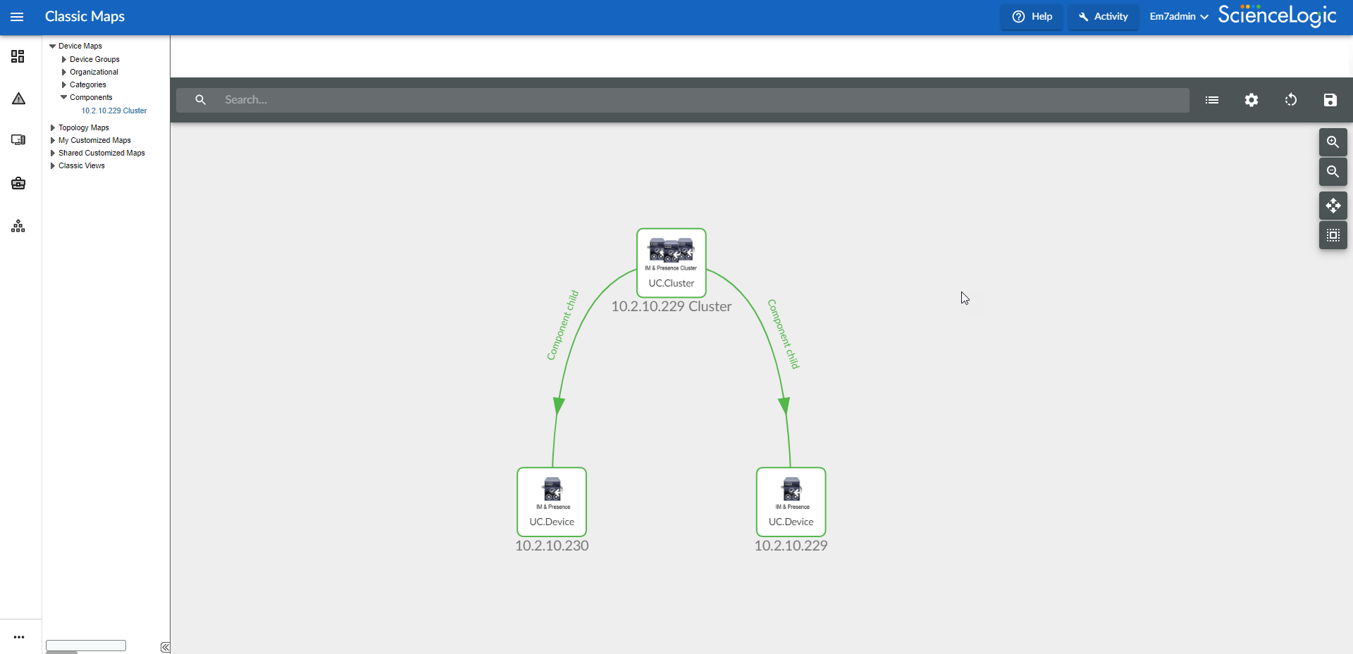 • The Component Map page (Classic Maps > Device Maps > Components) allows you to view devices by root node and view the relationships between root nodes, parent components, and child components in a map. This makes it easy to visualize and manage root nodes and their components. Skylar One automatically updates the Component Map as new component devices are discovered. The platform also updates each map with the latest status and event information. To view the map for your VOS device clusters, go to the Component Map page and select a map from the list in the left NavBar. To learn more about the Component Map page, see the section on Views.
