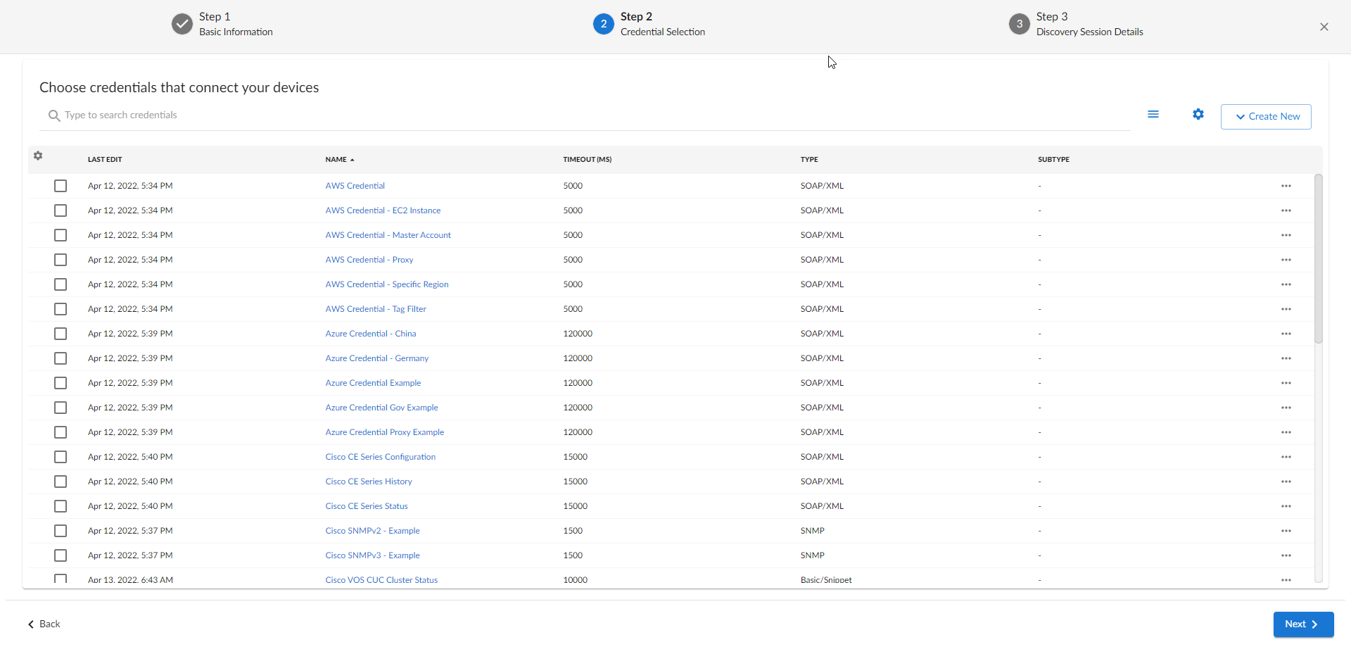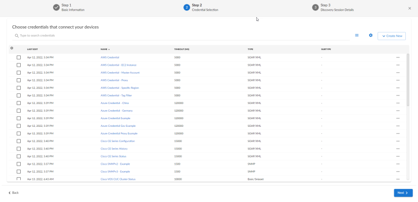 1. On the Select Credentials page, locate and select the credential(s) you created for the device clusters.