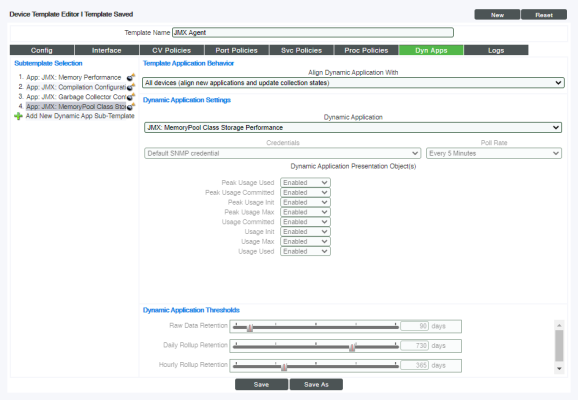 A device template allows you to save a device configuration and apply it to multiple devices. You can create a device template for the JMX Base Pack PowerPack to use when executing the Skylar One Agent with JMX. If you apply this device template during discovery, Skylar One aligns the appropriate Dynamic Applications to the discovered JMX device.