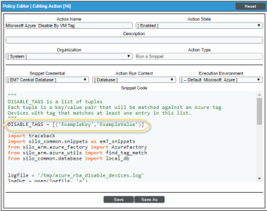The snippet for the "Microsoft Azure: Disable by VM Tag" Run Book Action includes the pre-defined list of key/value pairs that Skylar One compares to the tags collected from Azure. You must modify this list to include the key/value pairs that you want to use to disable VM instances.
