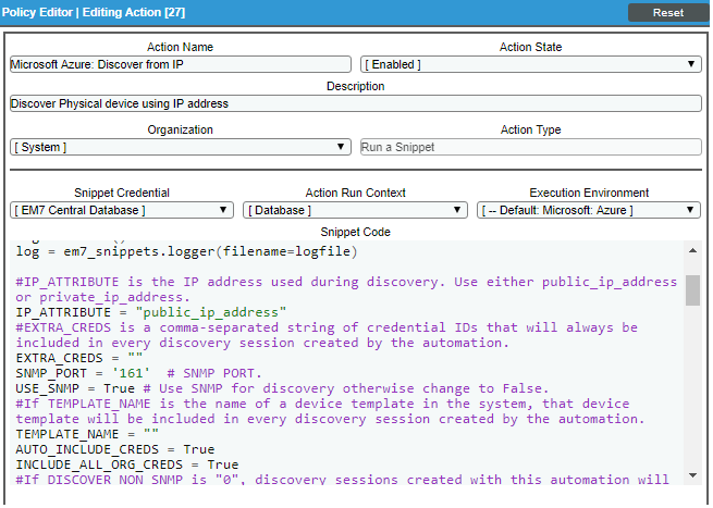 ) for the "Microsoft Azure: Discover from IP" Run Book Action. - In the Snippet Code field, locate and edit the lines for the parameters you want to change: