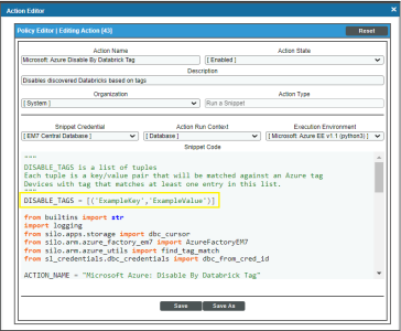 The snippet for the "Microsoft: Azure Disable By Databrick Tag" Run Book Action includes the pre-defined list of key/value pairs that Skylar One compares to the tags collected from Azure. You must modify this list to include the key/value pairs that you want to use to disable Databrick instances.