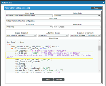 ) for the "Microsoft Azure: Collect VM configuration" Run Book Action. - In the Snippet Code field, locate and edit the port_to_use variable with the desired discovery port.