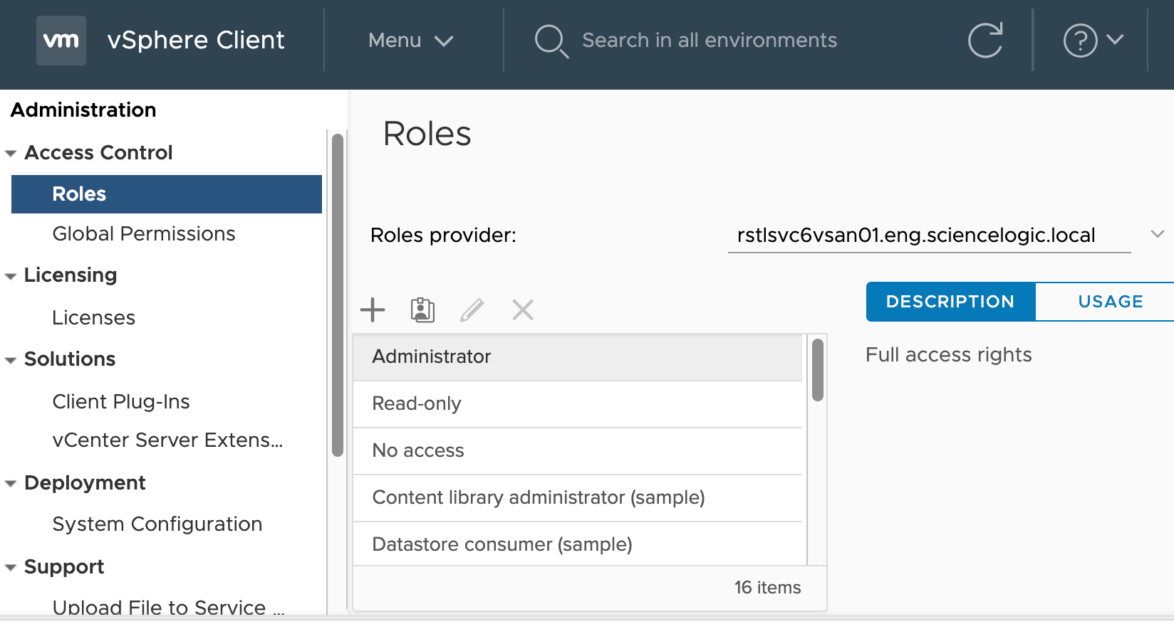 Administrative users are the only default user type that have the level of access Skylar One requires to collect data from the VMware vCenter web service. If you do not want to use the username and password of an administrative user in the SOAP/XML credential, you can set up a custom user role with the specific read-only access Skylar One requires to the VMware vCenter web service.