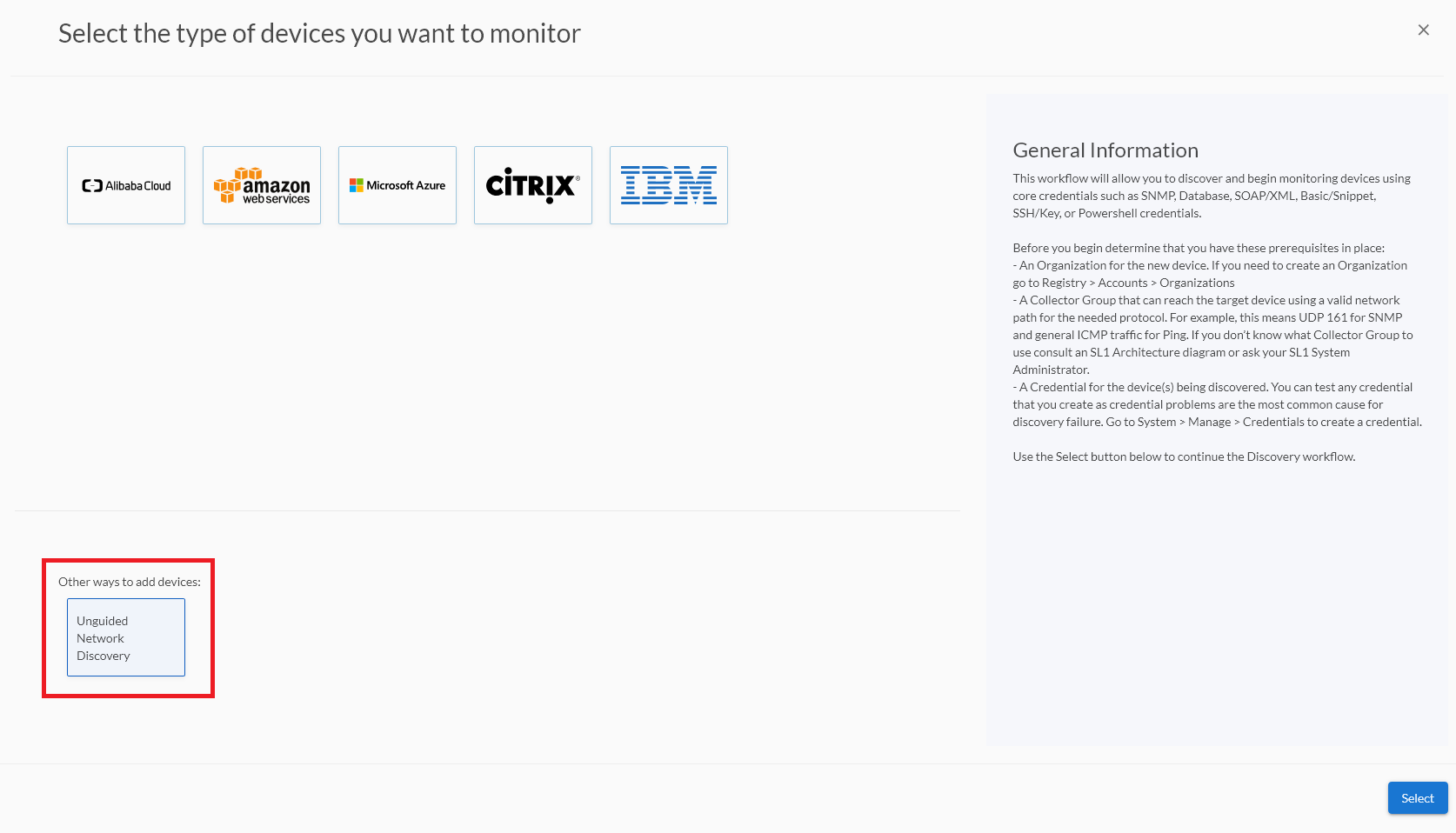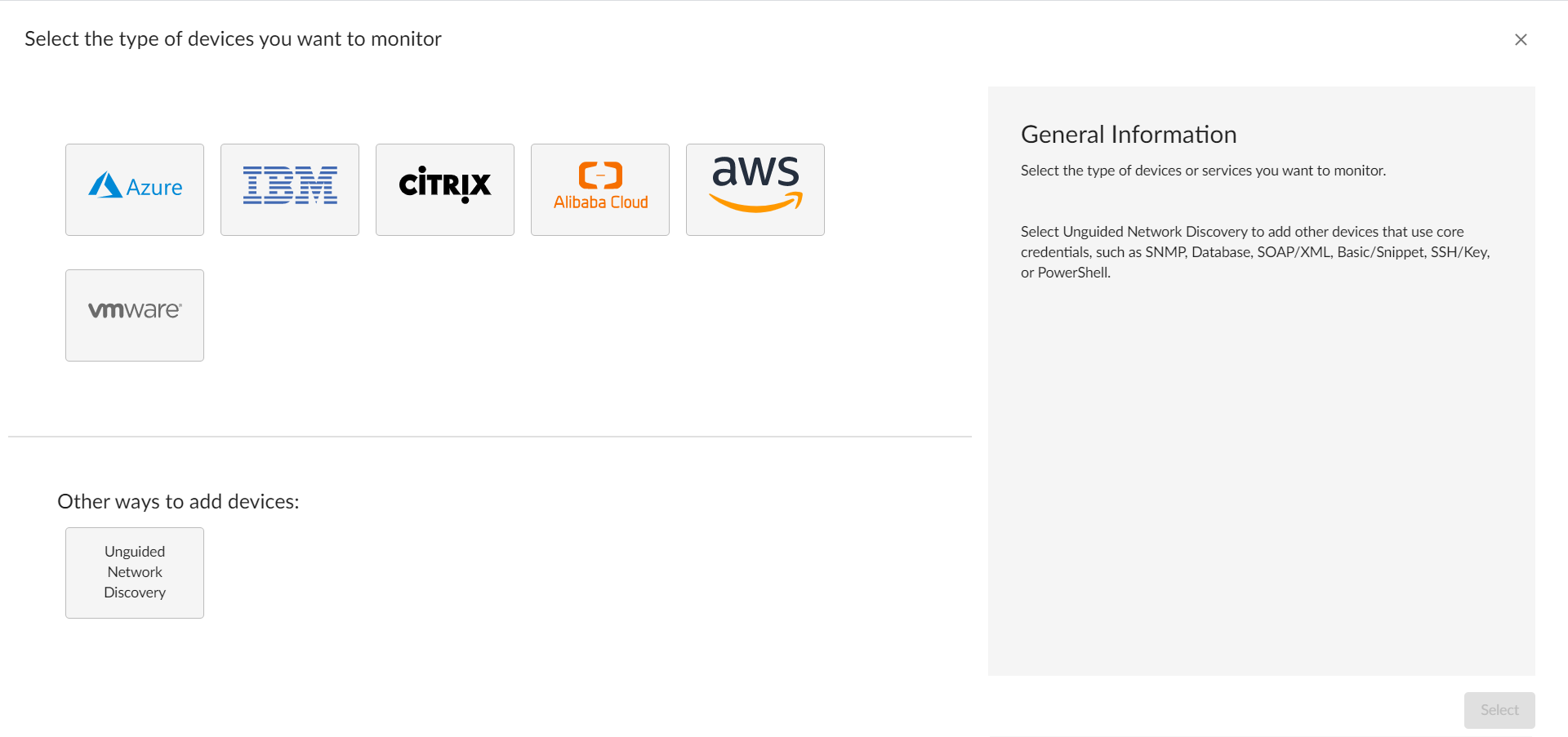 The guided discovery process lets you select a discovery type specific to the type of devices you want to monitor, in addition to traditional SNMP discovery. The guided discovery wizard provides a filtered list of relevant credentials, the ability to create new credentials, and a reduced set of application-specific fields to help you efficiently discover the devices you need.