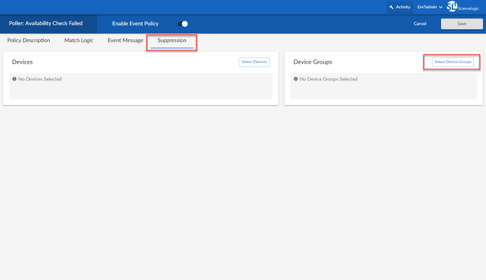 1. Locate the Poller: Availability Check Failed policy, click the actions icon () and select Edit. The Policy Description page appears. Click the Suppression tab.