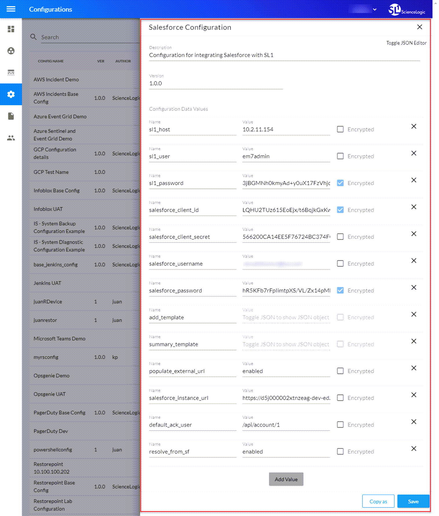 The "Base Salesforce Configuration" configuration object contains all of the required variables. Simply update the variables from that object to match your SL1 and Salesforce settings.