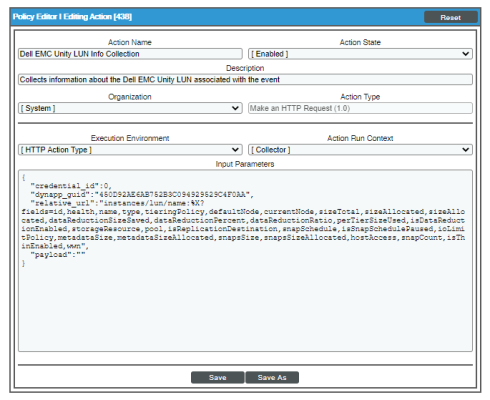 - Action Type. Type of action that will be executed. The "Dell EMC Unity Automations" PowerPack uses the HTTP Action Type.
