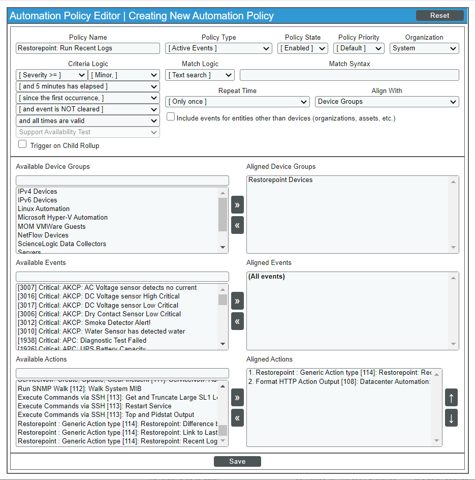 • Aligned Device Groups. The policy is configured to trigger for devices in the "Restorepoint Devices" device group.