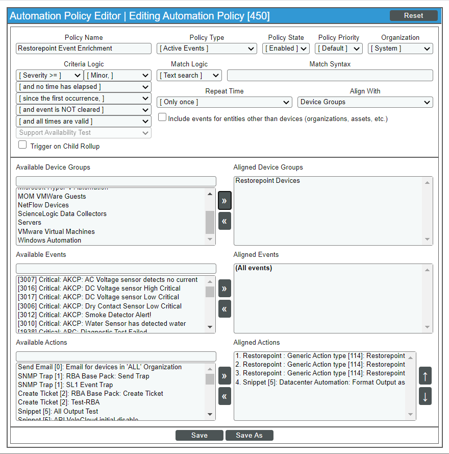 • Aligned Actions. This field includes the actions from the Restorepoint Automation  PowerPack. You should see "Restorepoint" actions in this field. To add an action to the Aligned Actions field, select the action in the Available Actions field and click the right arrow (>>). To re-order the actions in the Aligned Actions field, select an action and use the up arrow or down arrow buttons to change that action's position in the sequence.