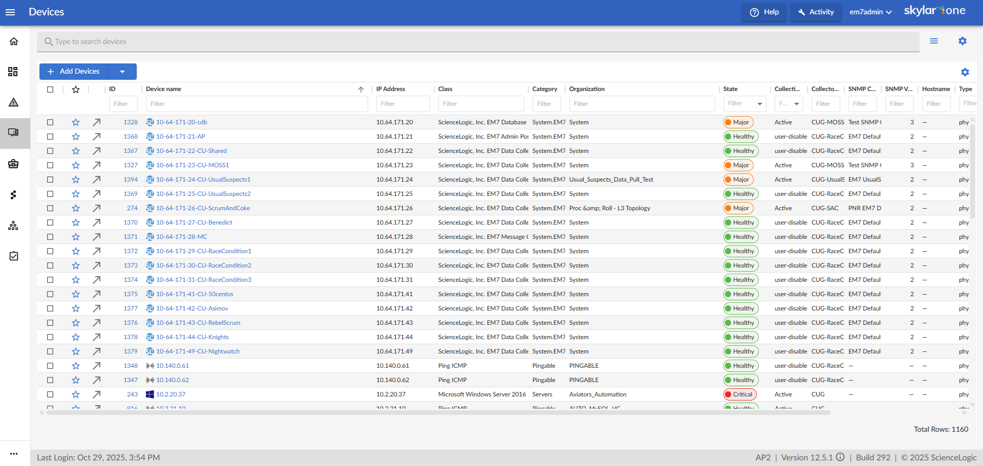 The Devices page allows you to view all of your managed devices in Skylar One (formerly SL1) and also run a discovery to find more devices to monitor. You can select a device from the list on the Devices page to view detailed data on the Device Investigator page for that device.