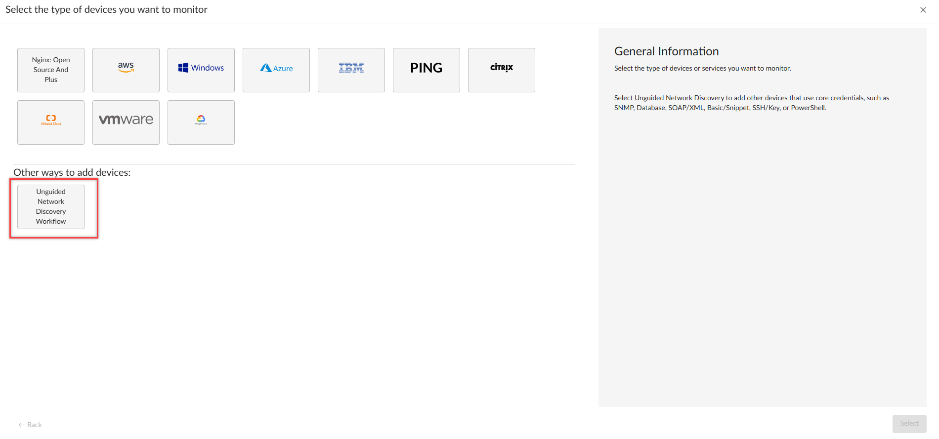 2. Click the Unguided Network Discovery Workflow button. Additional information about that requirements for discovery appears in the General Information pane to the right.