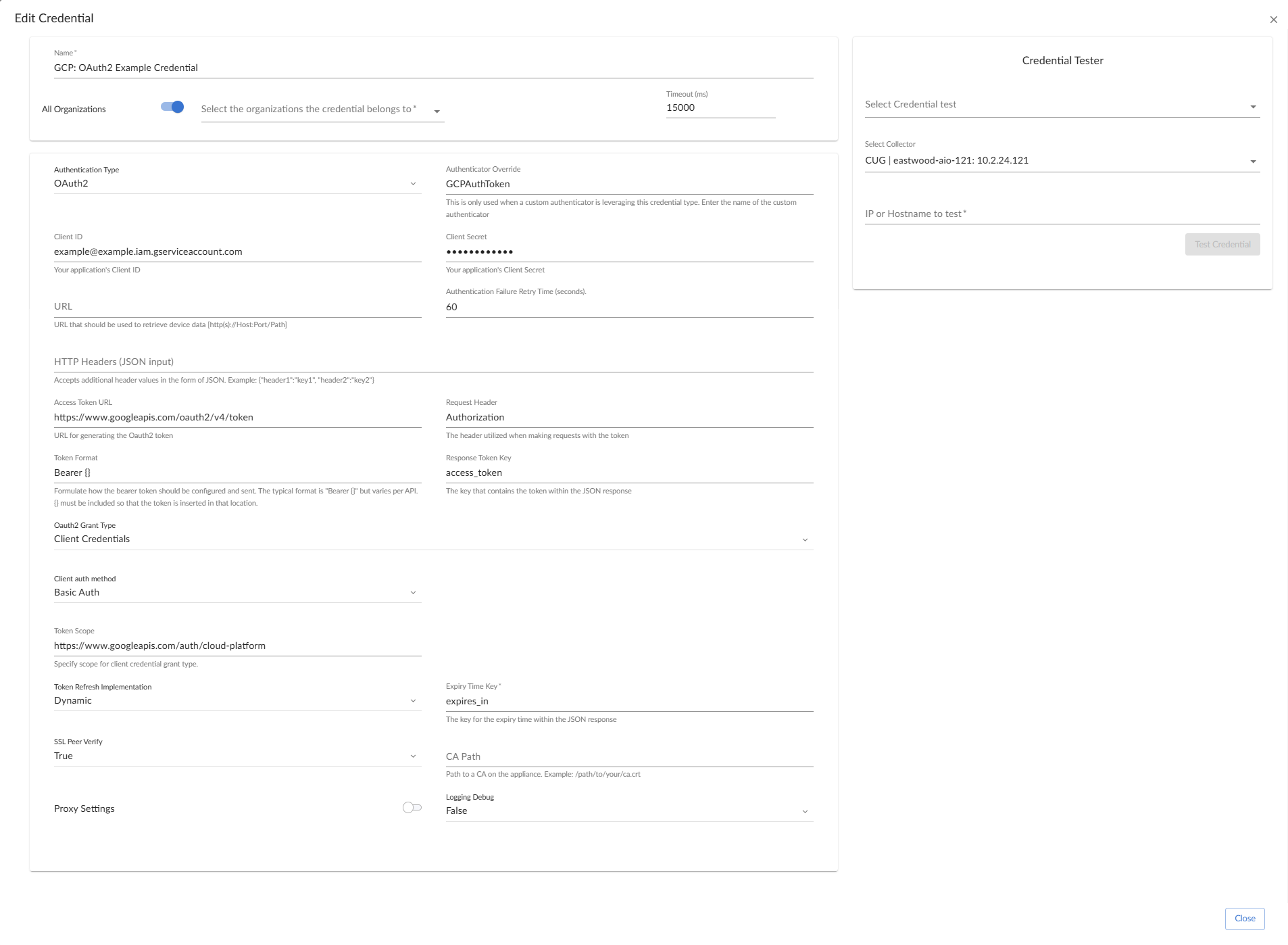 3. Click the Actions icon () for the GCP: OAuth2 Credential Example copy credential and select Edit. The Edit Credential modal page appears.