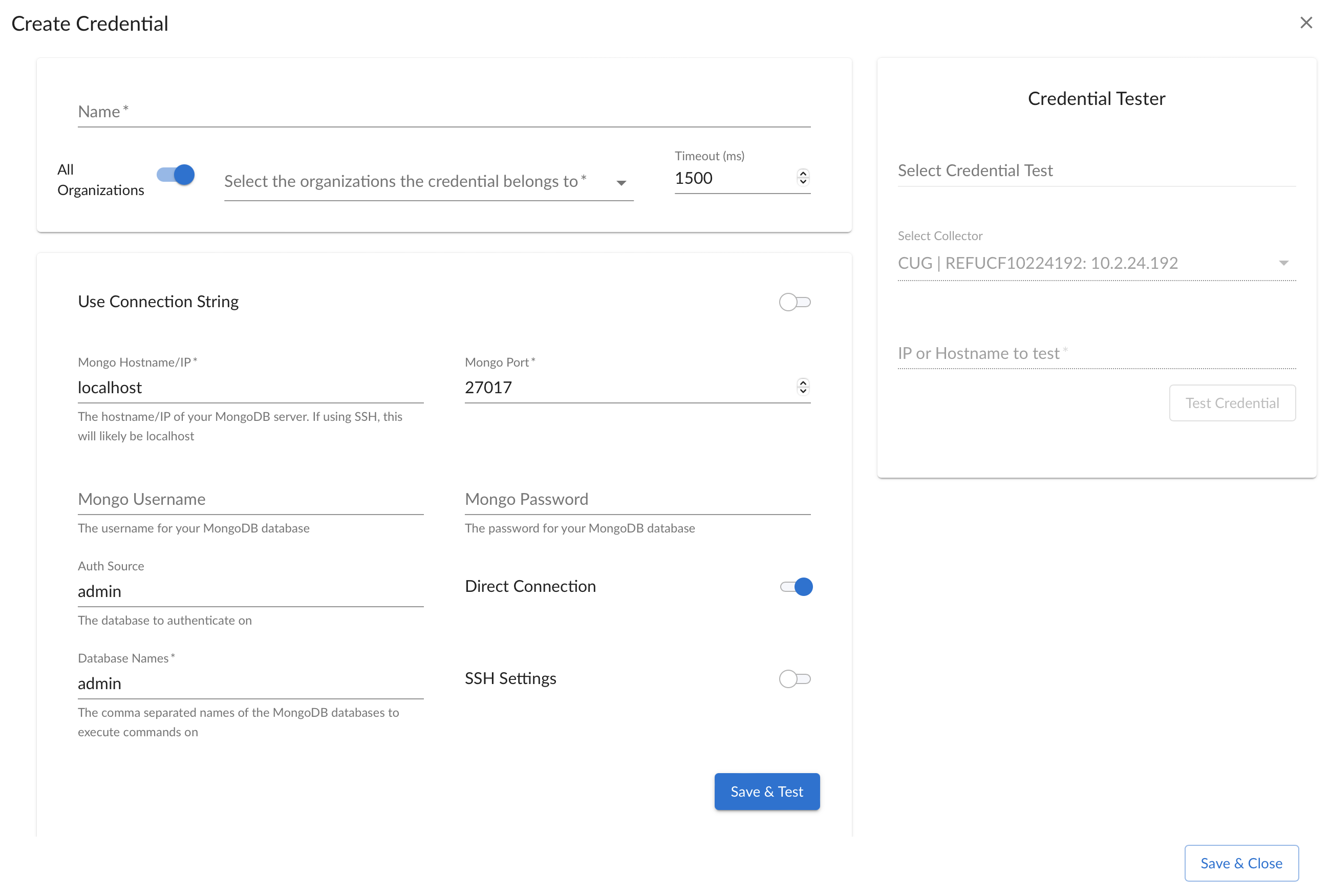 In the Name field, type a name for the credential and provide the IP address or host name of the server in the Mongo Hostname/IP field.