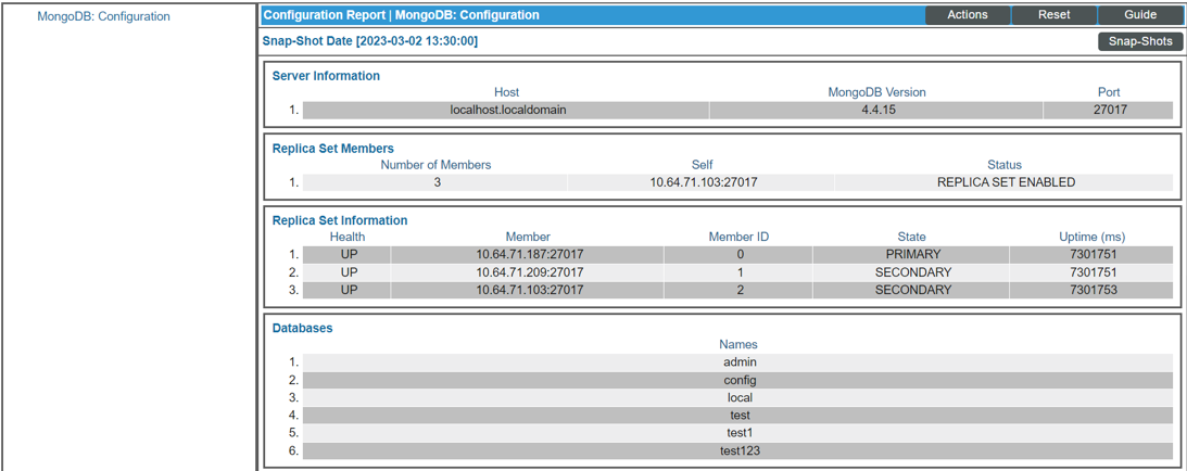 Number of Replica Set Members Replica Set Host Names Database Names Host Port MongoDB Version Self State Status Uptime |